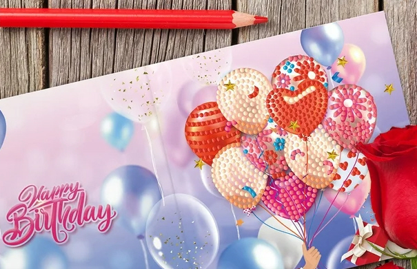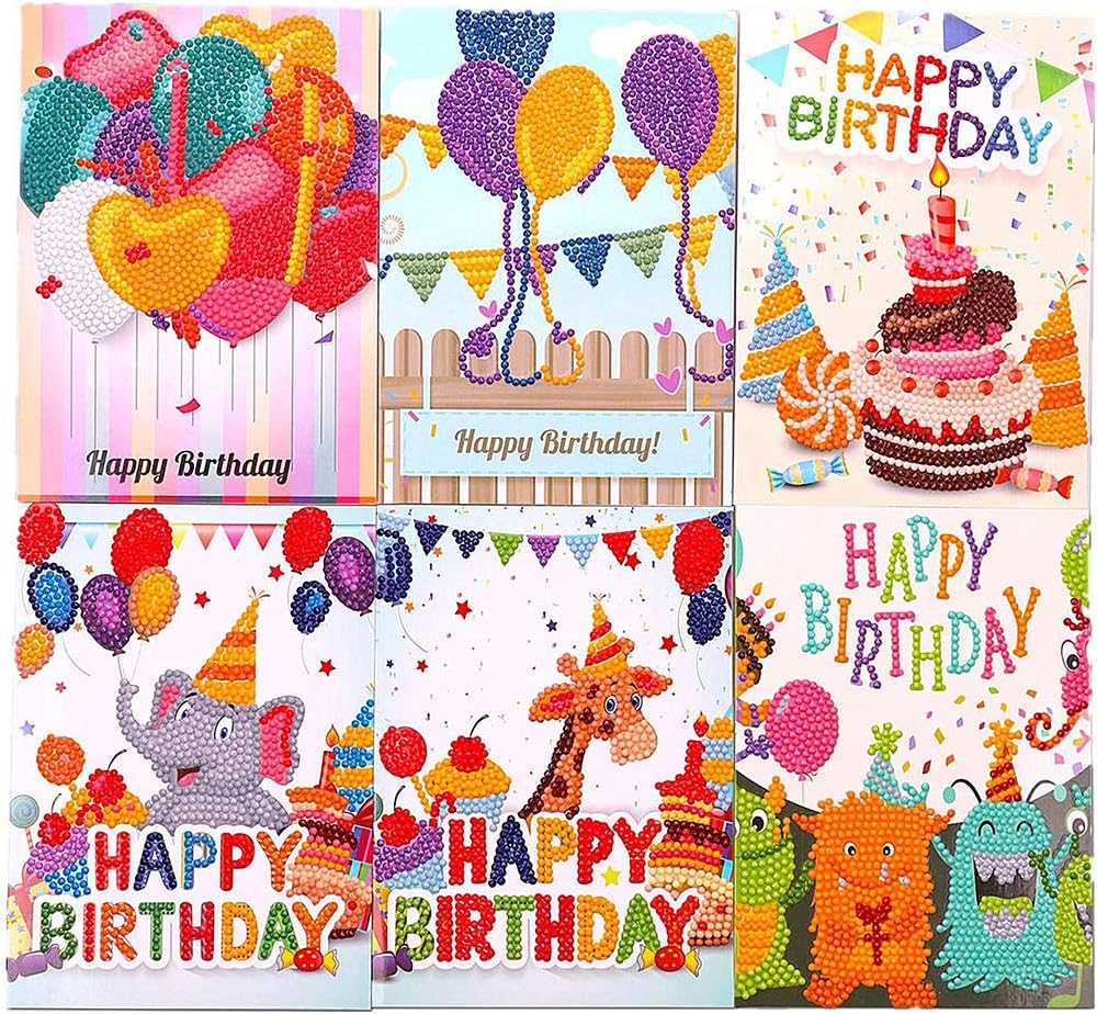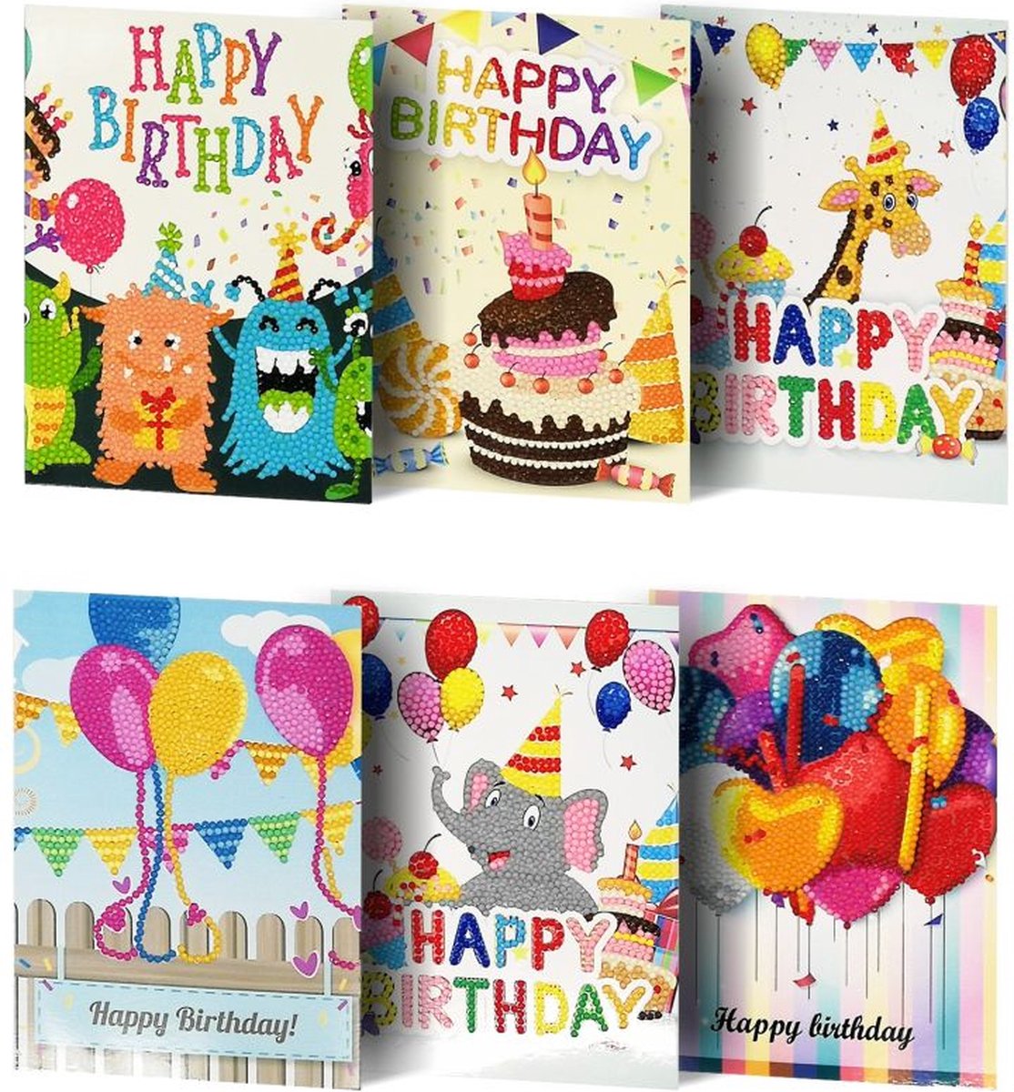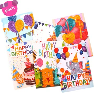 Maak elke verjaardag onvergetelijk met deze charmante 6-pack Diamond Painting verjaardagswenskaarten! Elke kaart heeft een prachtig, kleurrijk ontwerp – van schattige dieren en speelse monsters tot ballonnen en verjaardagstaarten – tot leven gebracht met schitterende diamantkralen die schitteren in het licht.