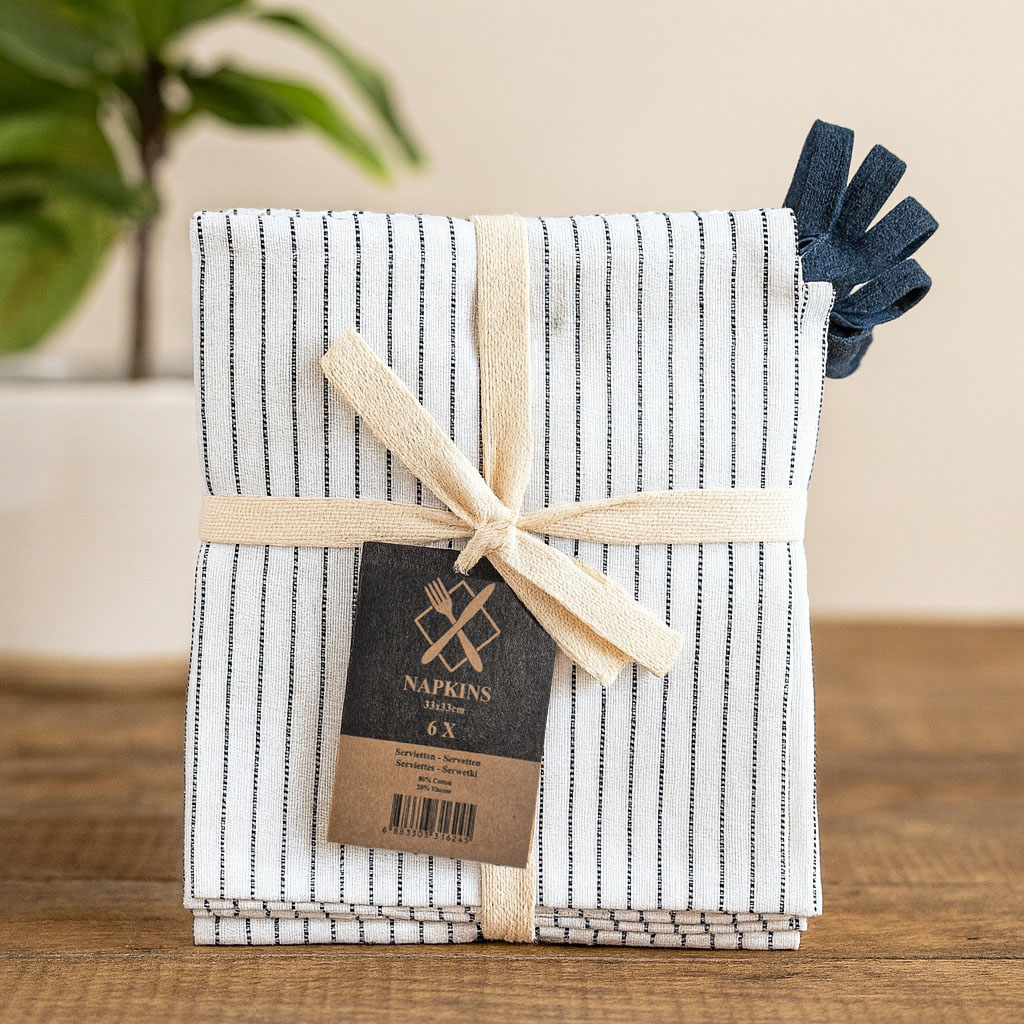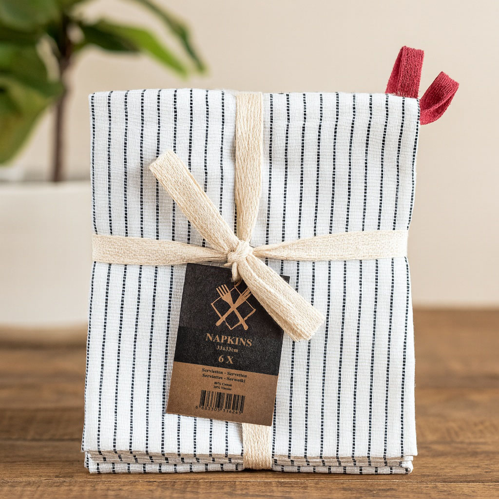 Verfraai uw tafelaankleding met deze premium 6-pack gestreepte servetten. Zorgvuldig vervaardigd van zachte, duurzame stof, heeft elk servet een klassiek geweven streeppatroon dat moeiteloos stijl toevoegt aan zowel informele diners als speciale gelegenheden. De set is netjes verpakt met een natuurlijk lint en voorzien van handige stoffen lussen voor eenvoudig ophangen en opbergen.