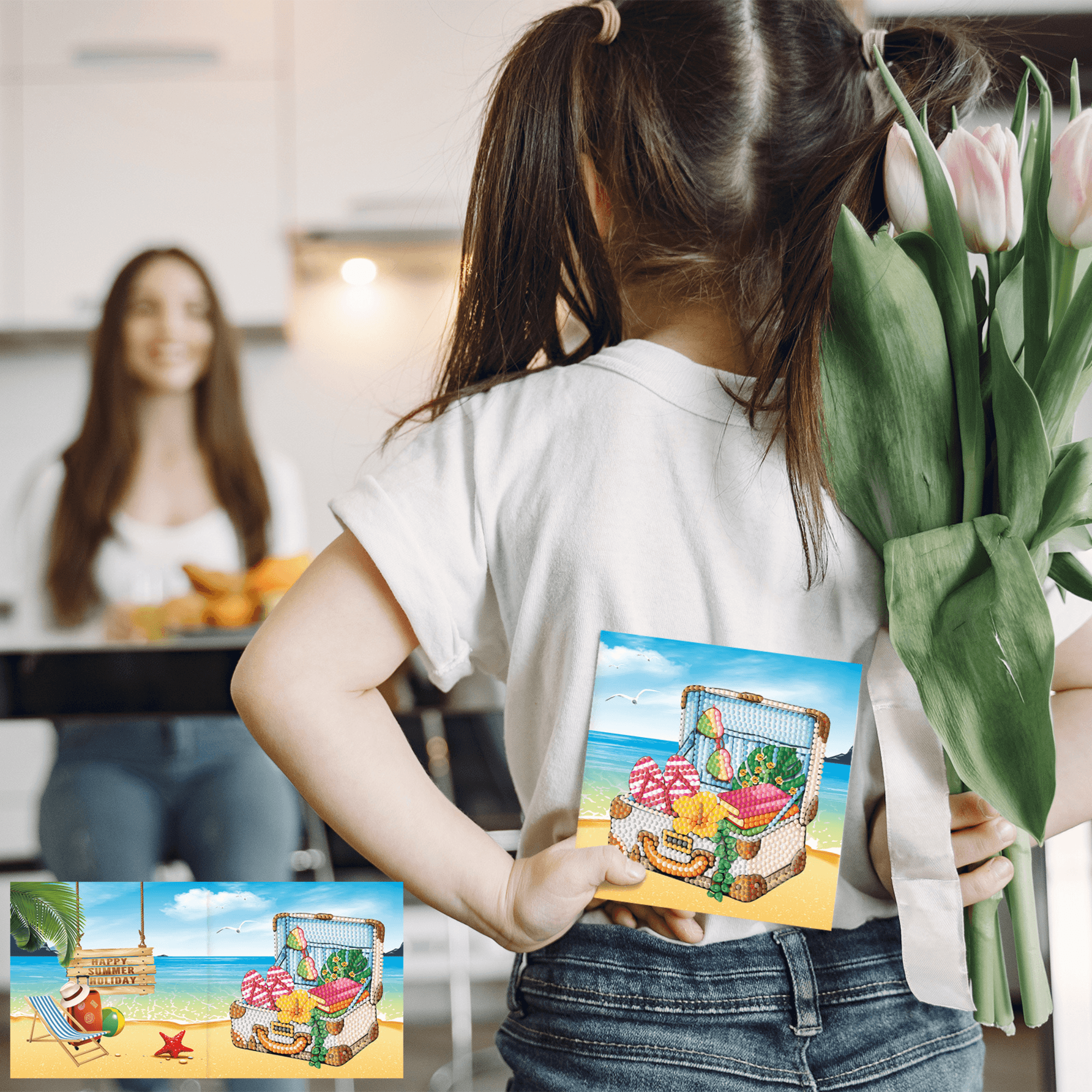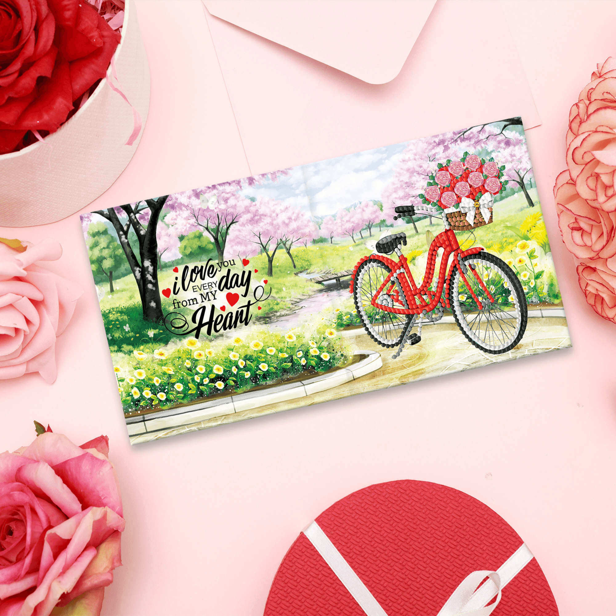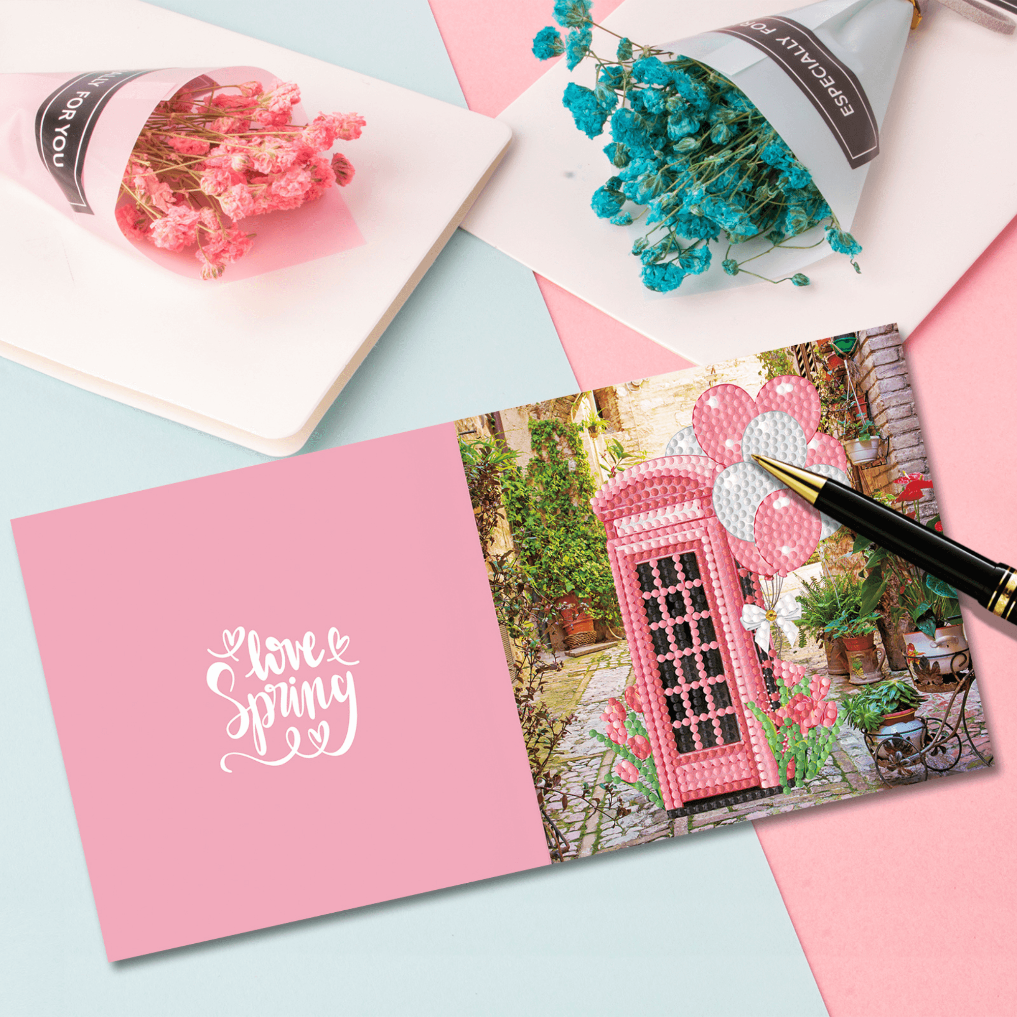 Deze 8-pack Diamond Painting wenskaarten bevat een vrolijke collectie bloemen- en lentethema’s, elk gedrukt op hoogwaardig karton en voorzien van glinsterende harsstrass-steentjes voor een handgemaakte, gestructureerde afwerking. De set bevat charmante taferelen zoals bloeiende boeketten in vazen ​​en manden, een vrolijke fiets omringd door bloesems, een koffer vol kleurrijke reisaccenten en een schilderachtig straatbeeld met bloemen en ballonnen, allemaal ontworpen om te worden versierd met de meegeleverde diamanten.
