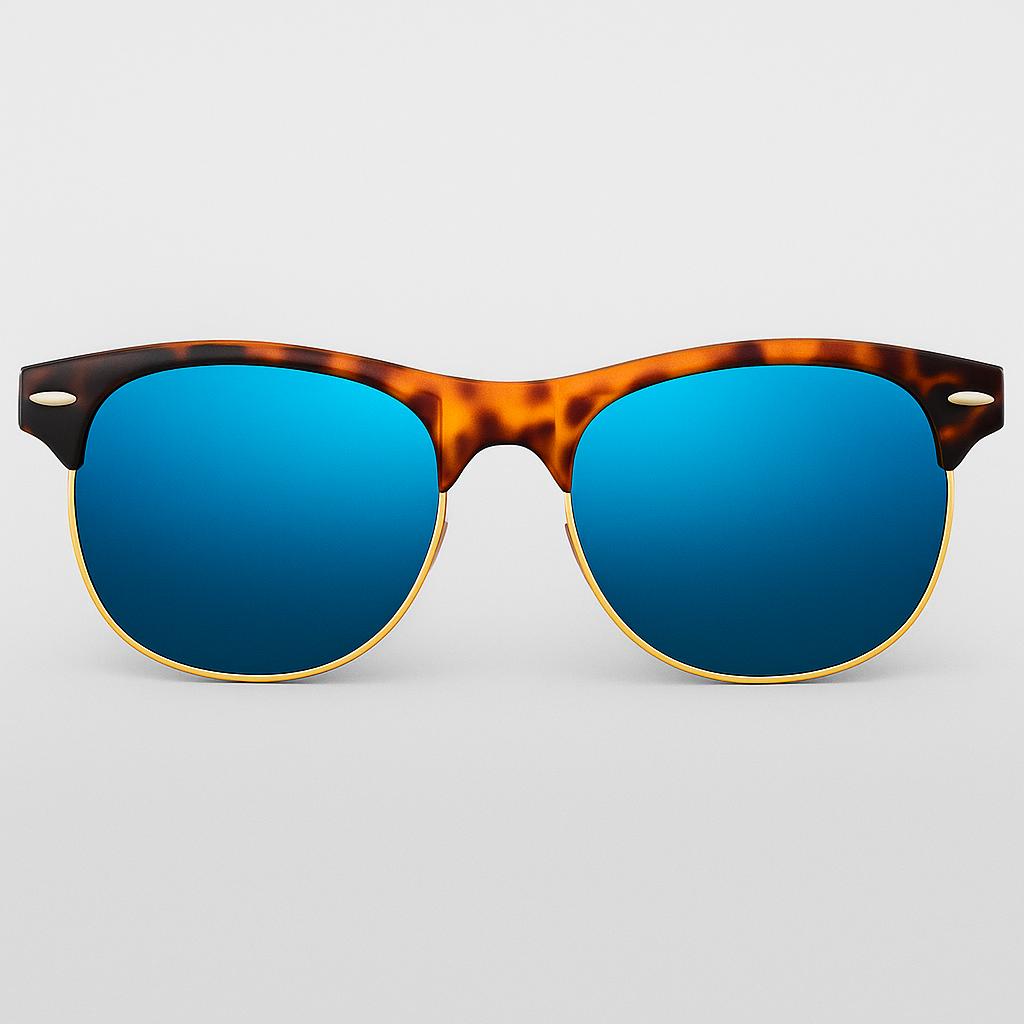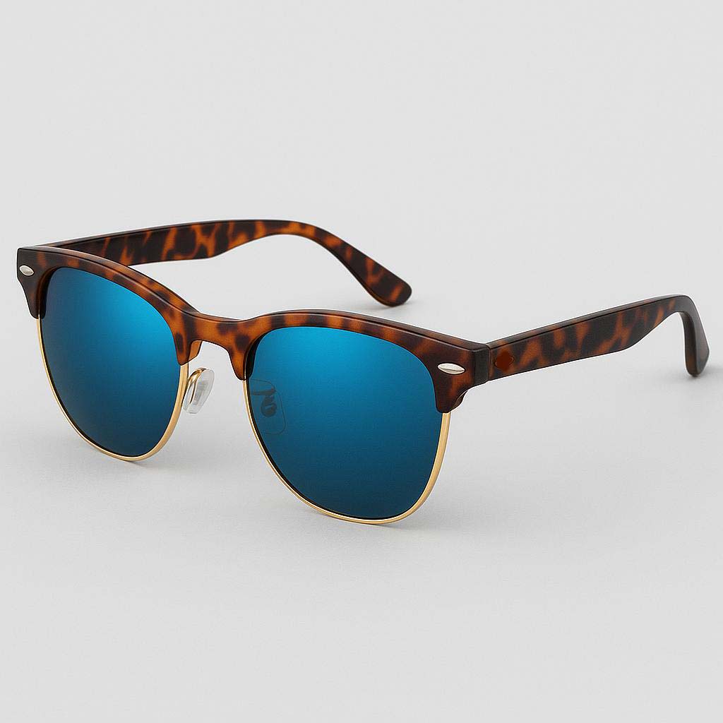 Maak een statement met deze tijdloze Clubmaster zonnebril, die vintage charme combineert met moderne verfijning. Met een rijk schildpadkleurig acetaat montuur en strakke goudkleurige accenten straalt deze zonnebril premium vakmanschap en moeiteloze stijl uit. De levendige blauwe spiegelglazen bieden 100% uv-bescherming en vormen een opvallend contrast met de warme amberkleurige tinten van het montuur.