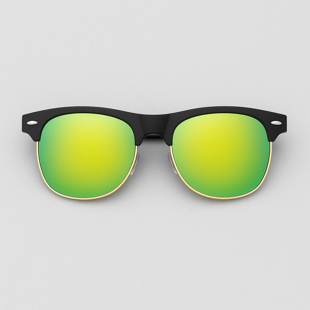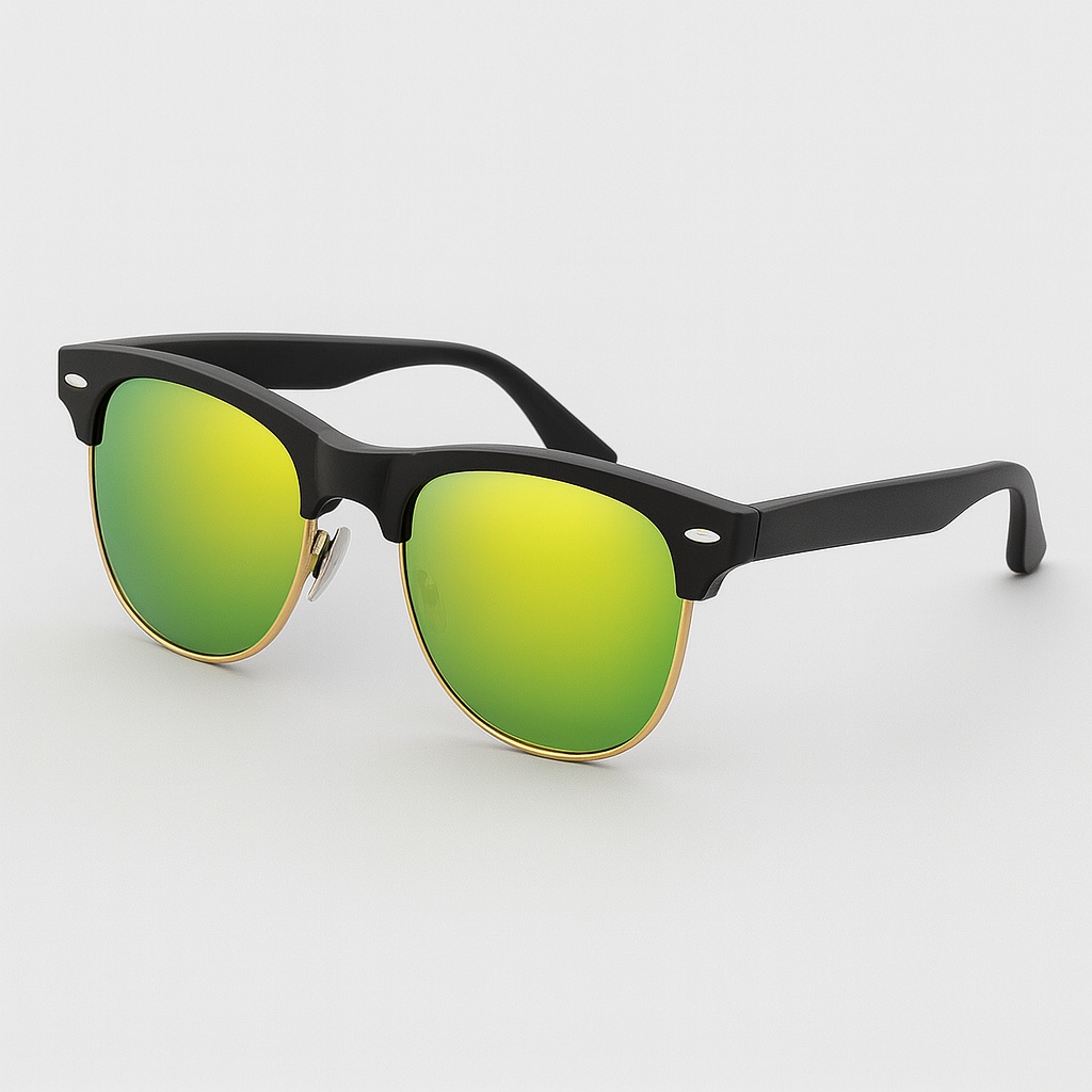 Verhoog je look met deze moderne zonnebril in Clubmaster-stijl die tijdloos design combineert met een gedurfde, reflecterende twist. Het matzwarte montuur en de gouden metalen rand zorgen voor een verfijnd contrast, terwijl de geelgroene spiegelglazen een levendige, opvallende look toevoegen.