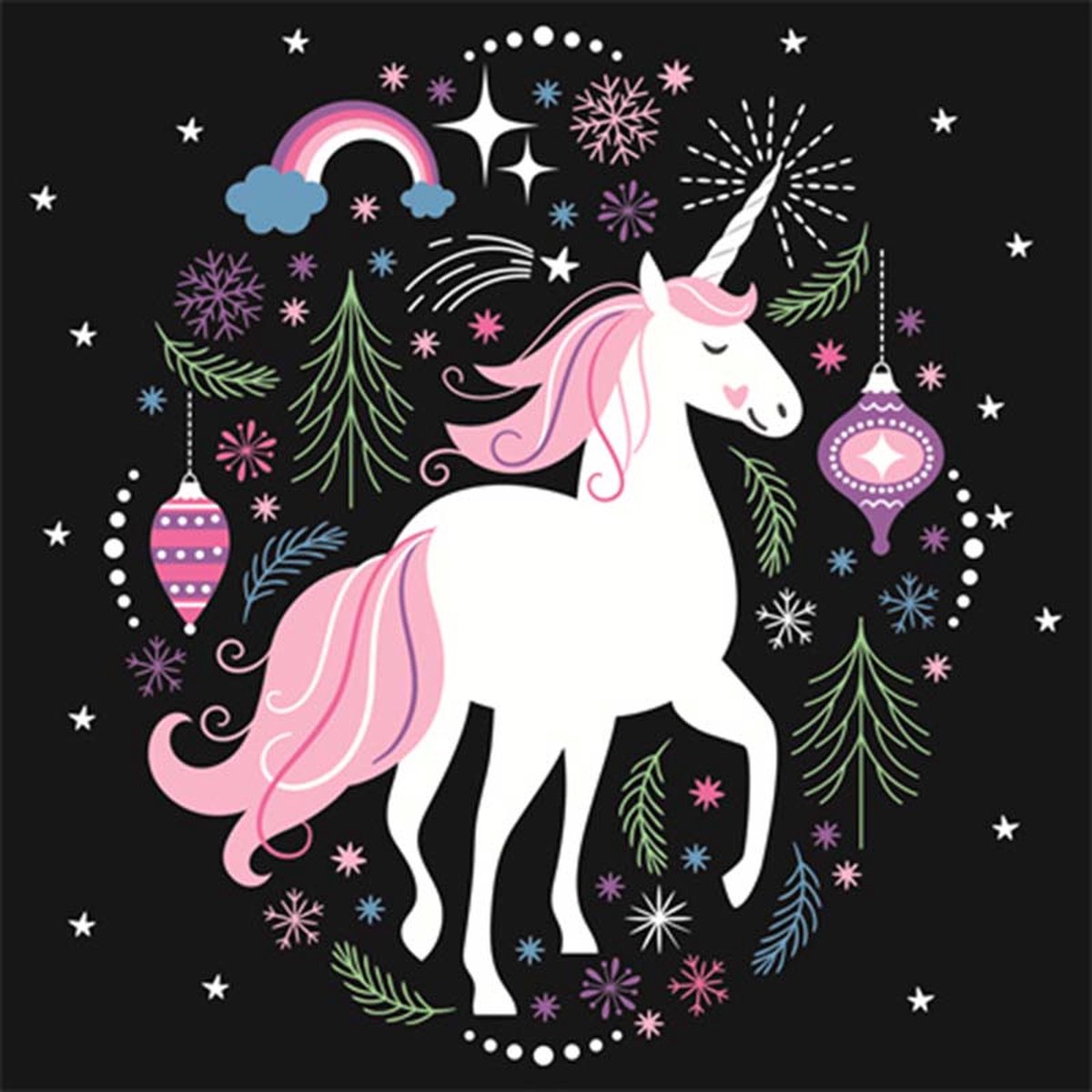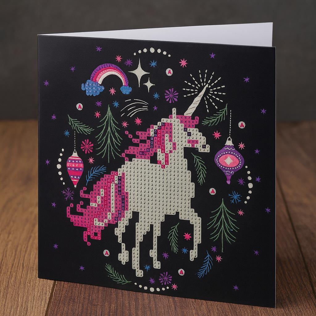 Laat je boodschap sprankelen met deze betoverende Diamond Painting Eenhoorn Wenskaart. Met een majestueuze eenhoorn omringd door feestelijke details – regenbogen, ornamenten, fonkelende sterren en groenblijvende takken – transformeert deze kaart een klassieke illustratie in een oogverblindende, praktische knutselervaring.