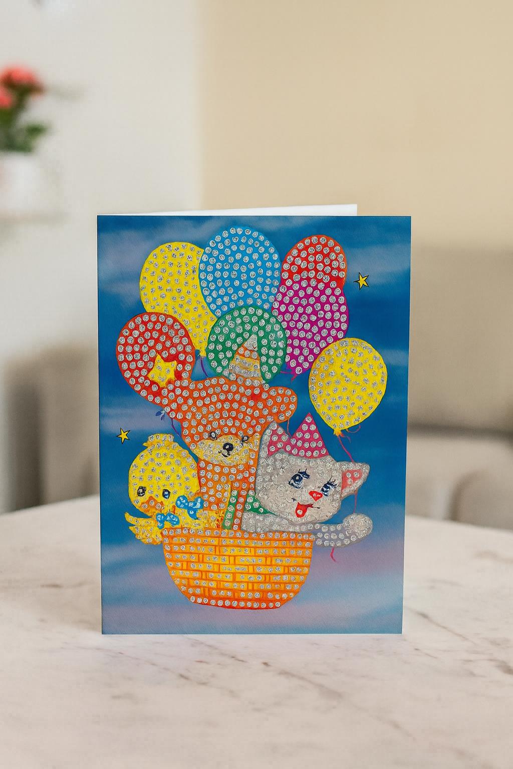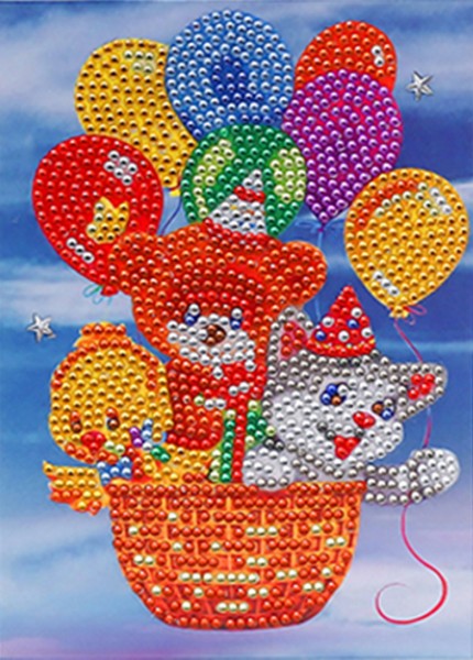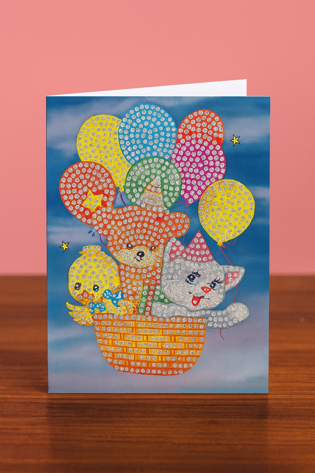 Geef elke gelegenheid extra glans met deze charmante diamond painting wenskaart! Met een schattig trio vrienden – een enthousiaste beer, een vrolijk kuiken en een speels poesje – die wegzweven op een bundel felgekleurde ballonnen, is deze kaart ontworpen om zowel kinderen als volwassenen te vermaken.