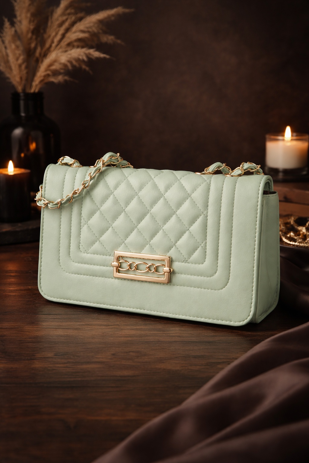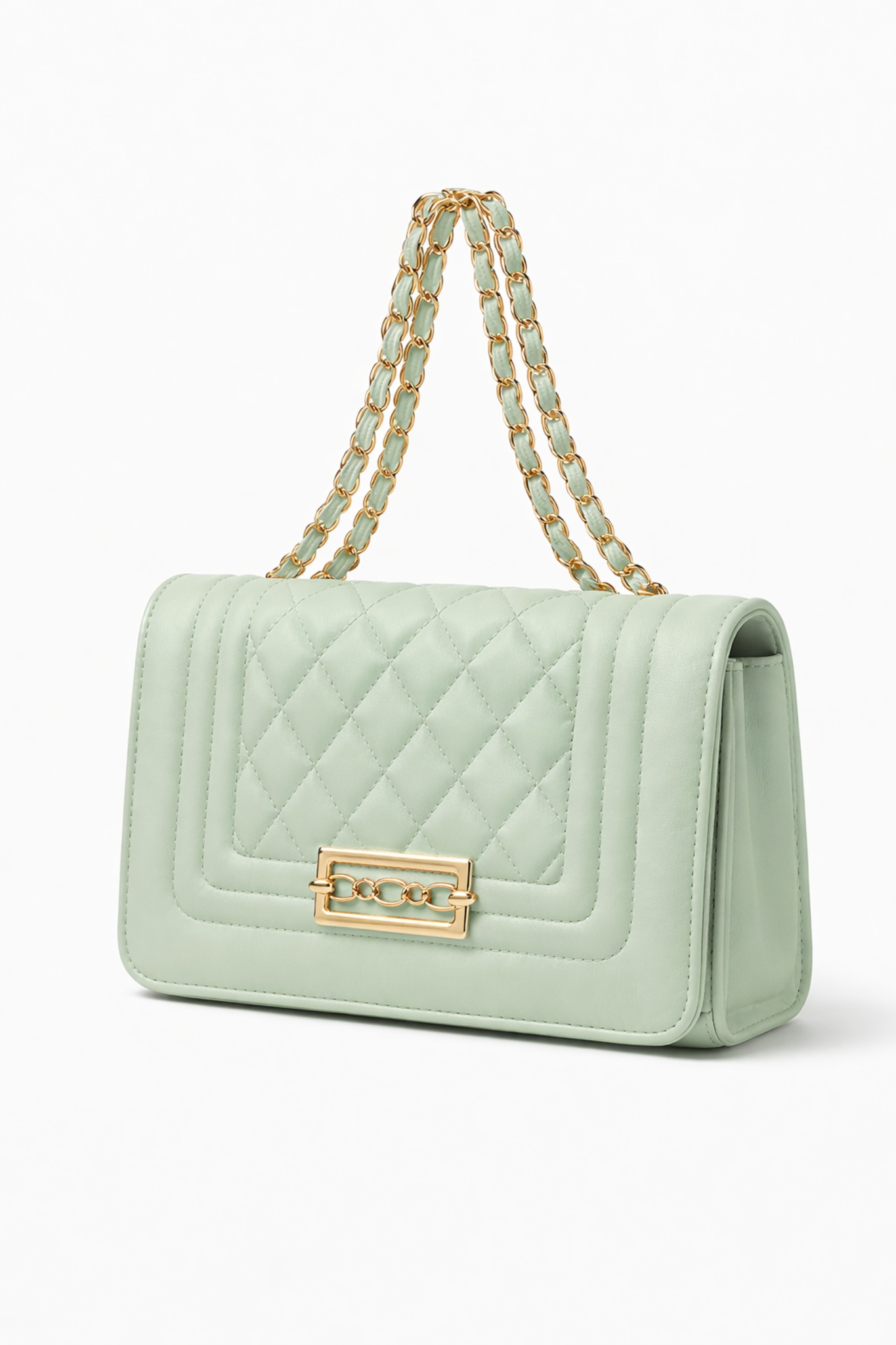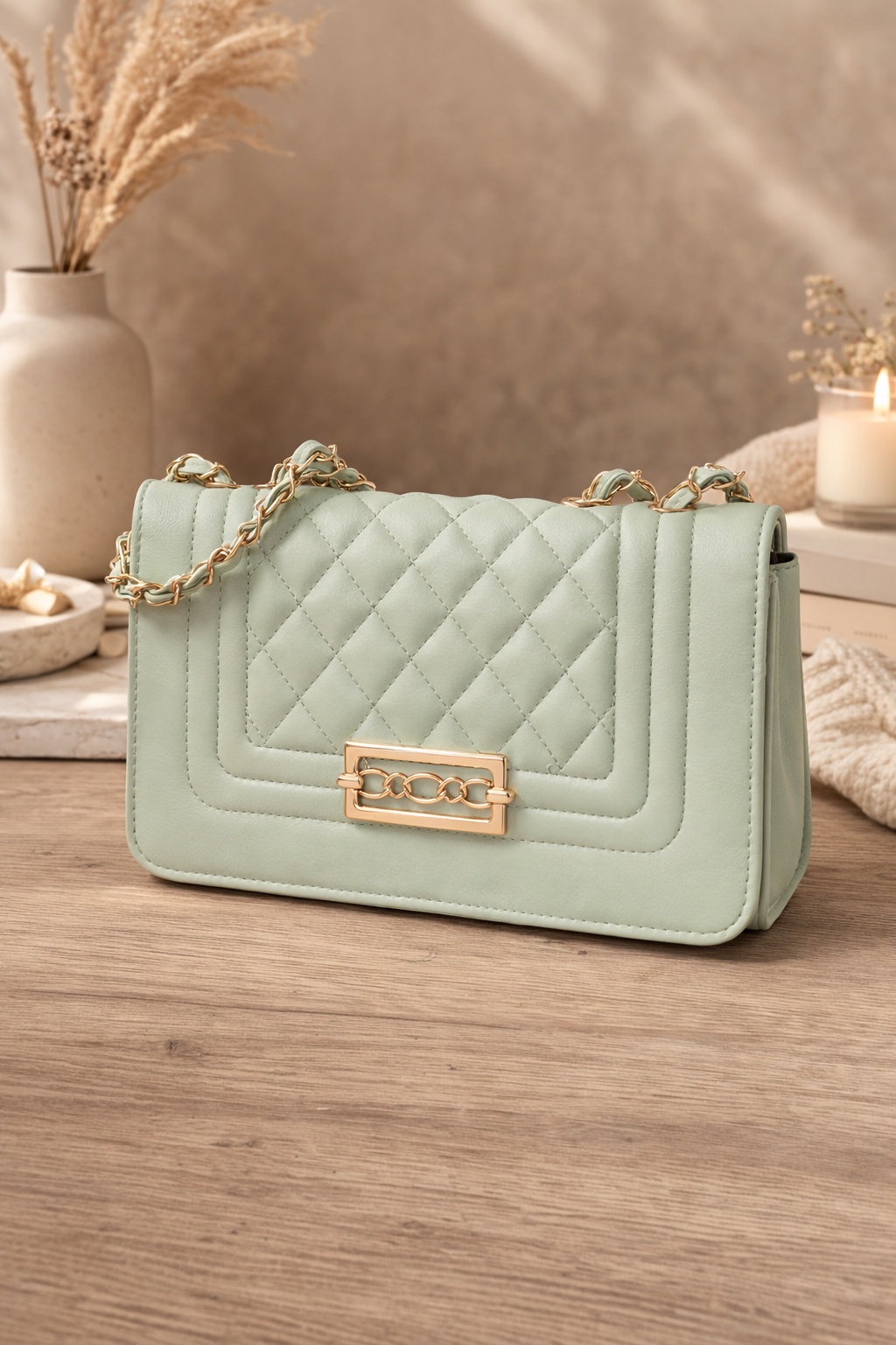 Geef je dagelijkse stijl een boost met deze verfijnde mintgroene gewatteerde schoudertas. Ontworpen met een gestructureerd silhouet en subtiele ruitvormige stiksels, combineert dit item moeiteloos klassieke elegantie met eigentijdse charme.