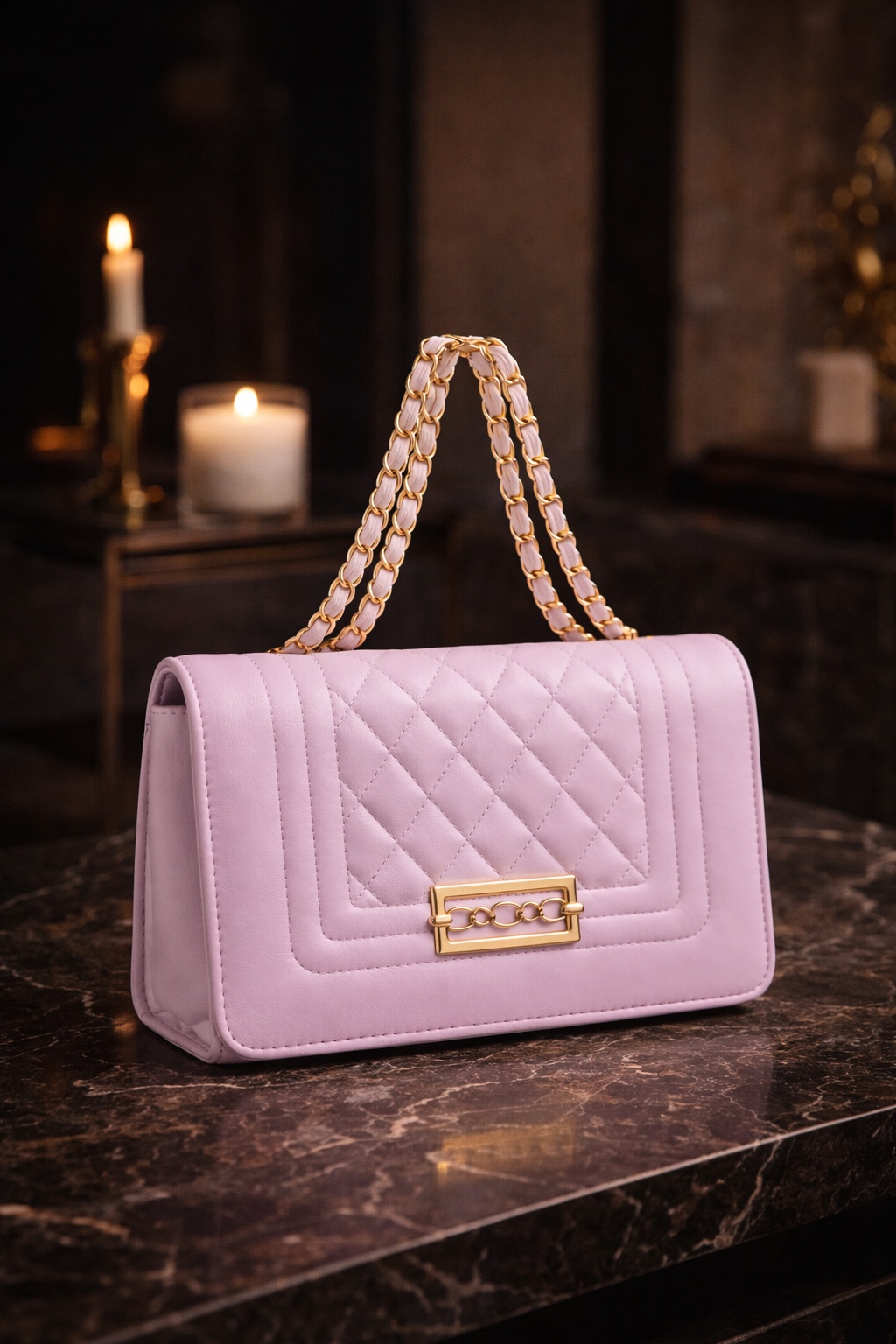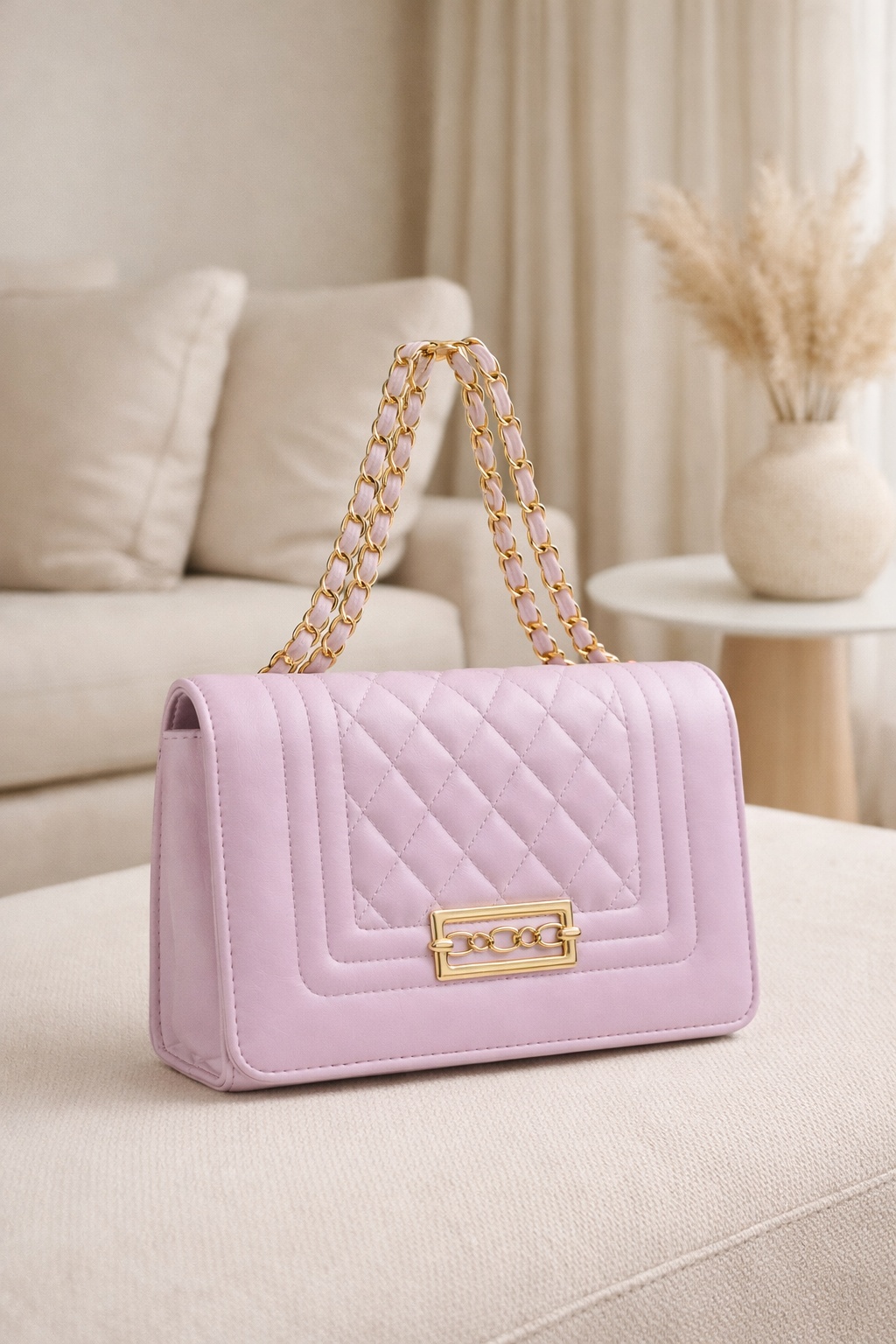 Geef je look een boost met deze elegante lavendelkleurige gewatteerde schoudertas, een tijdloos item dat verfijning combineert met moderne charme.