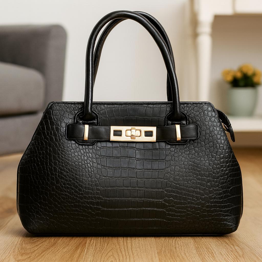 Refined, versatile, and effortlessly chic, this black-colored handbag brings timeless elegance to your everyday look. Crafted from faux leather with a subtle croc-embossed texture, it exudes sophistication while remaining durable and practical.
