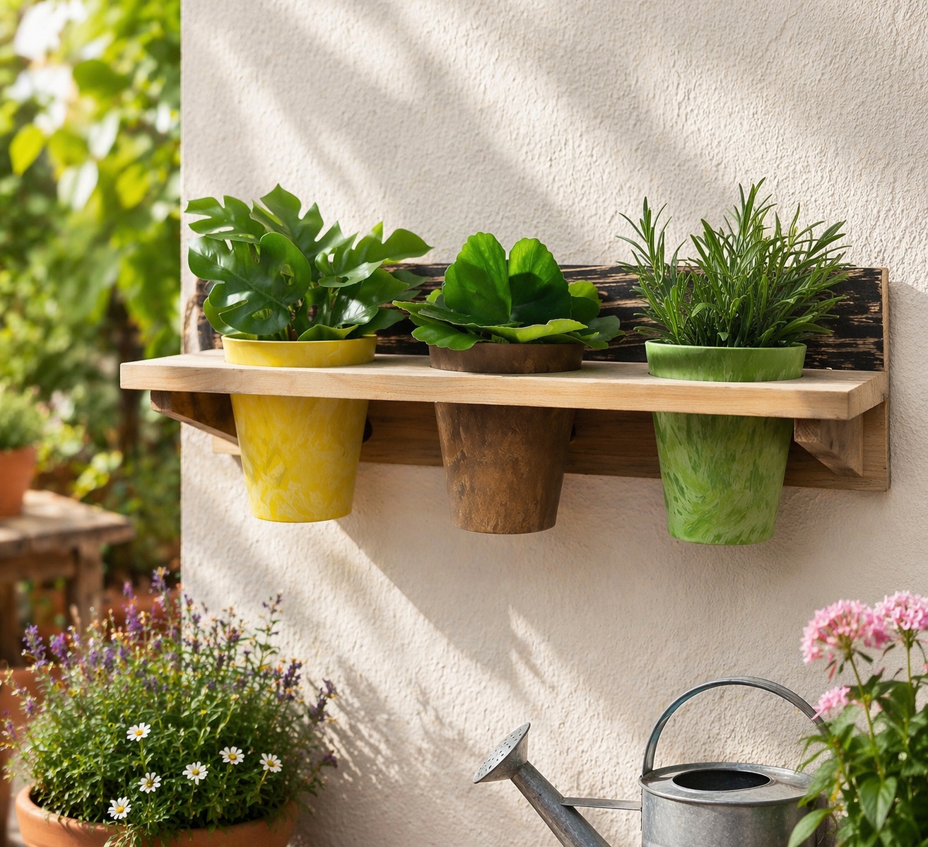 Add a natural and stylish touch to your space with this wall-mounted planter set, combining three Artstone pots with a rustic Roots wooden rack. Designed for both indoor and outdoor use, this compact setup is perfect for displaying herbs, flowers, or small plants while saving space.