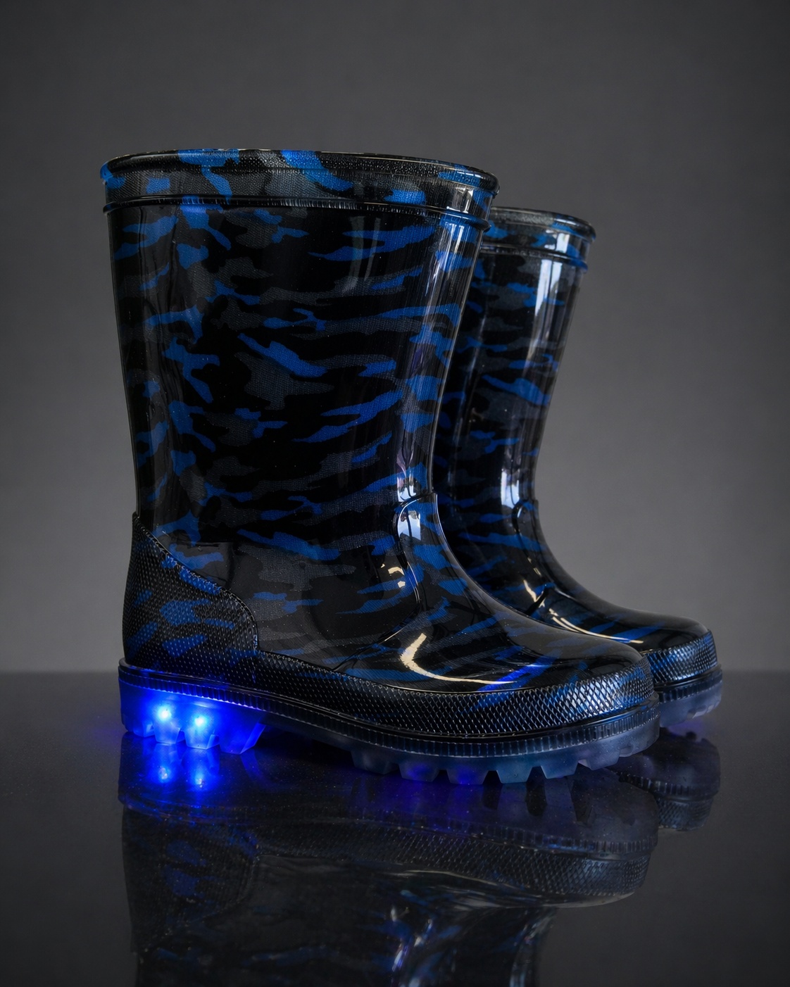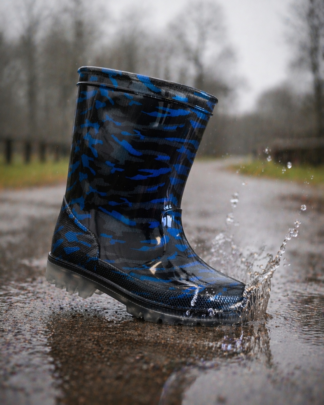 Maak regenachtige dagen leuker dan ooit met de Gevavi kinderregenlaarzen. Met een opvallende blauwe camouflageprint en een speelse, oplichtende zool maken deze laarzen van elke stap een avontuur.