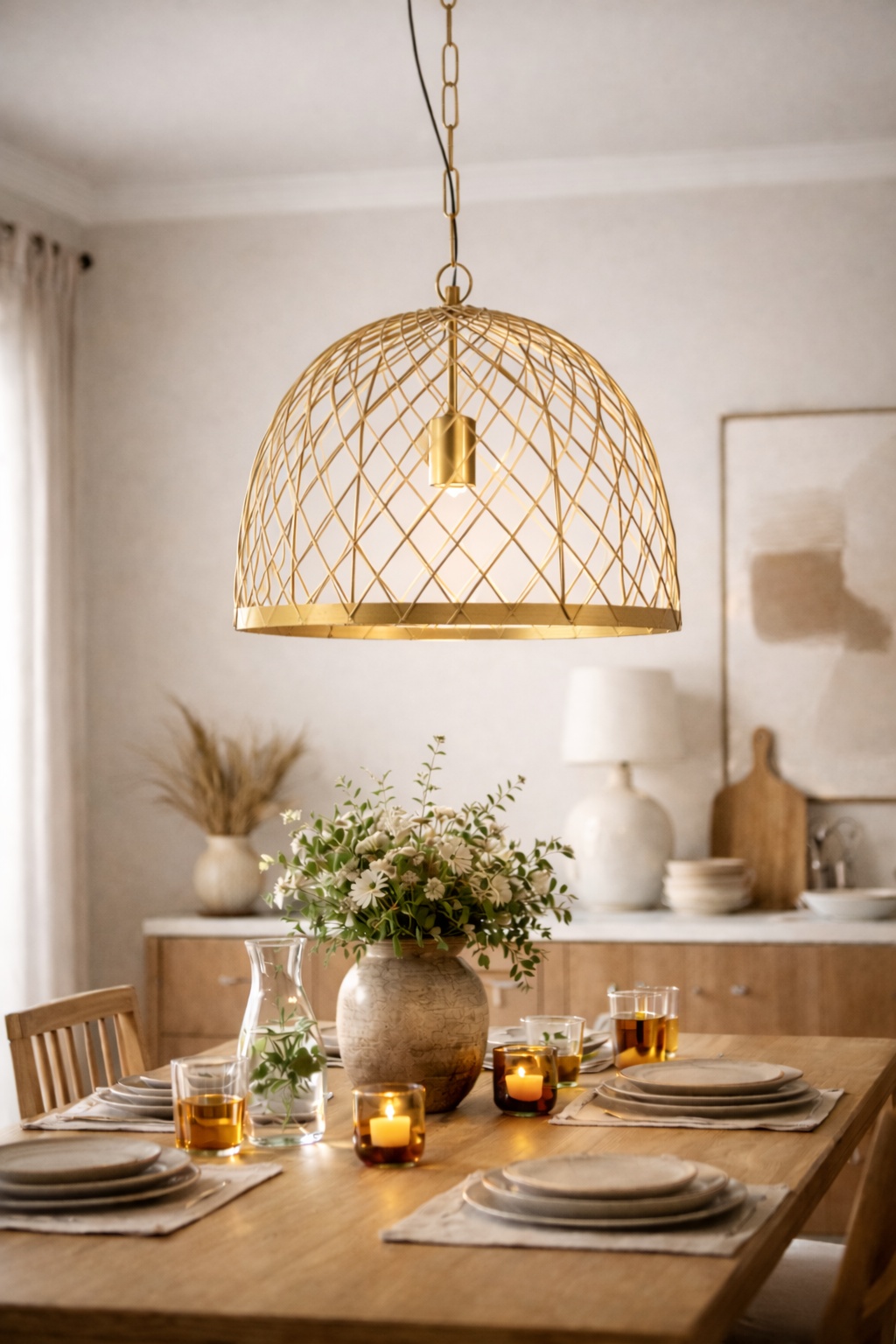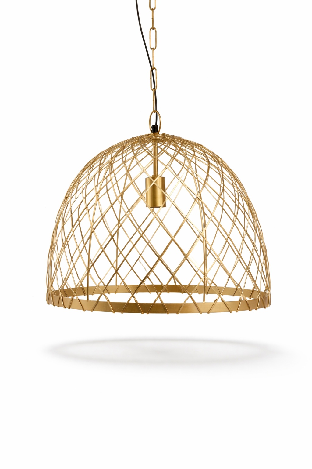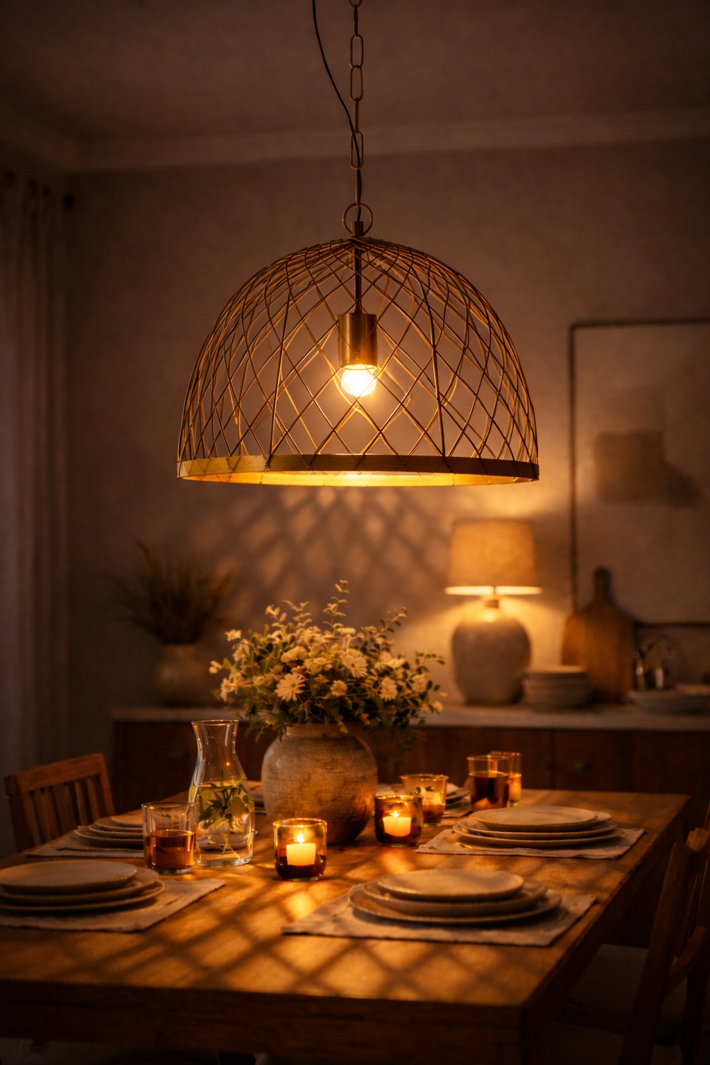 Het open rasterontwerp laat het licht prachtig door het metalen frame schijnen, waardoor een uniek en decoratief schaduwpatroon op muren en oppervlakken ontstaat. Dit subtiele lichteffect voegt diepte en sfeer toe aan eetkamers, woonkamers of slaapkamers.