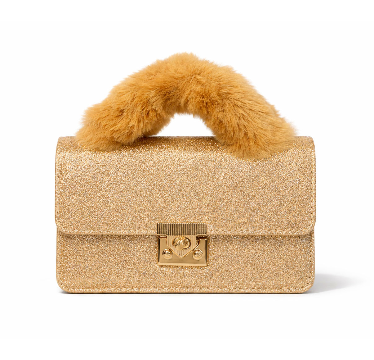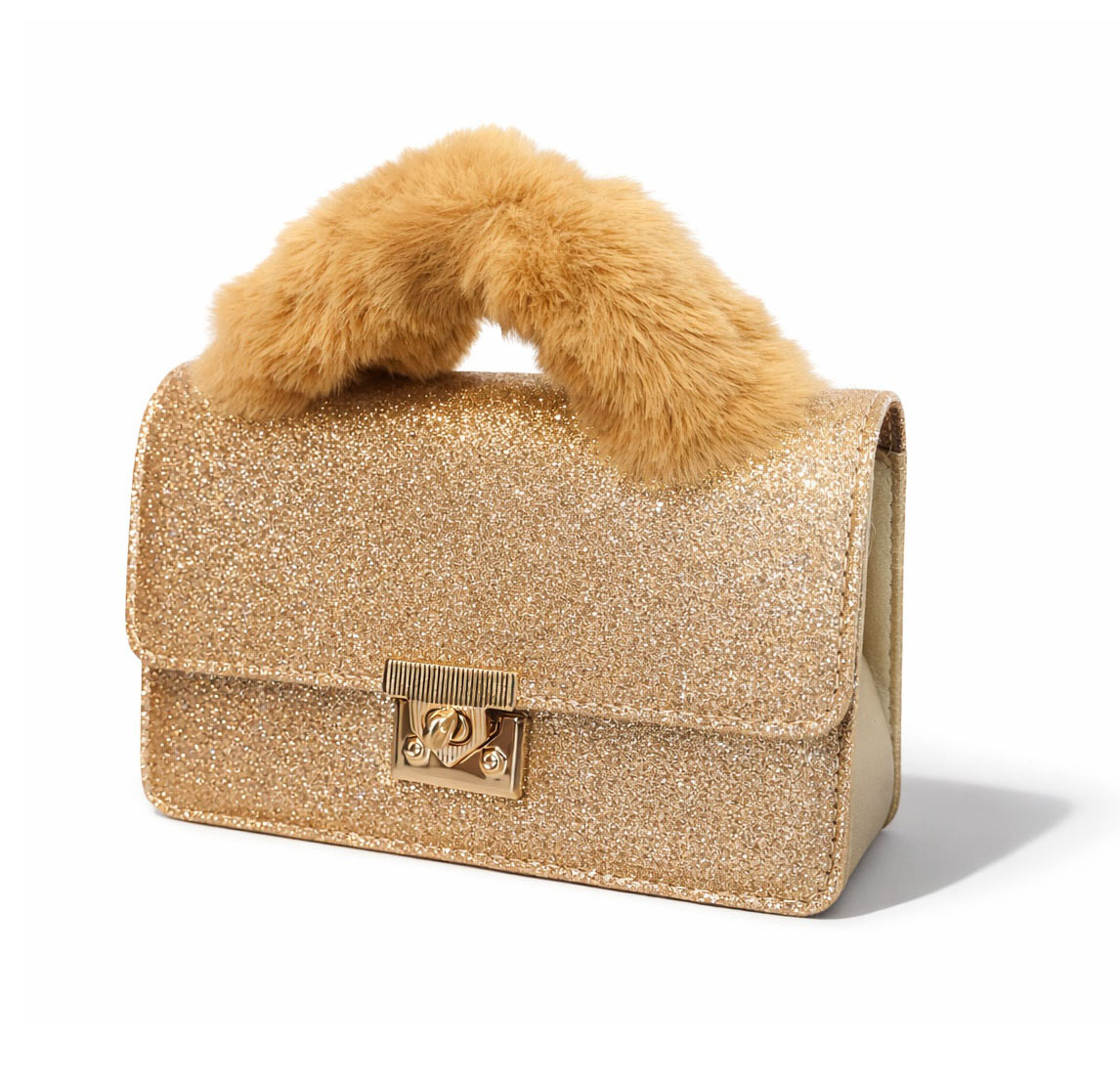 Het zachte handvat van imitatiebont voegt een luxueuze touch toe en vormt een uniek contrast met de sprankelende gouden body. Een gepolijste goudkleurige draaisluiting houdt je spullen veilig en versterkt de verfijnde uitstraling van de tas.