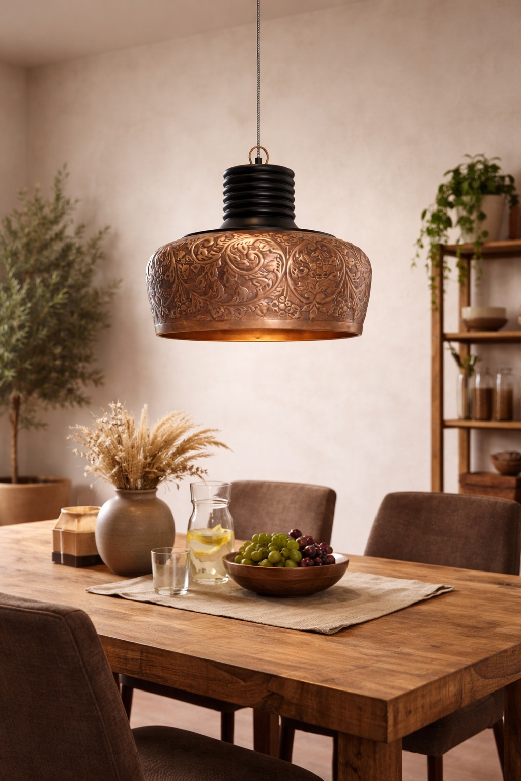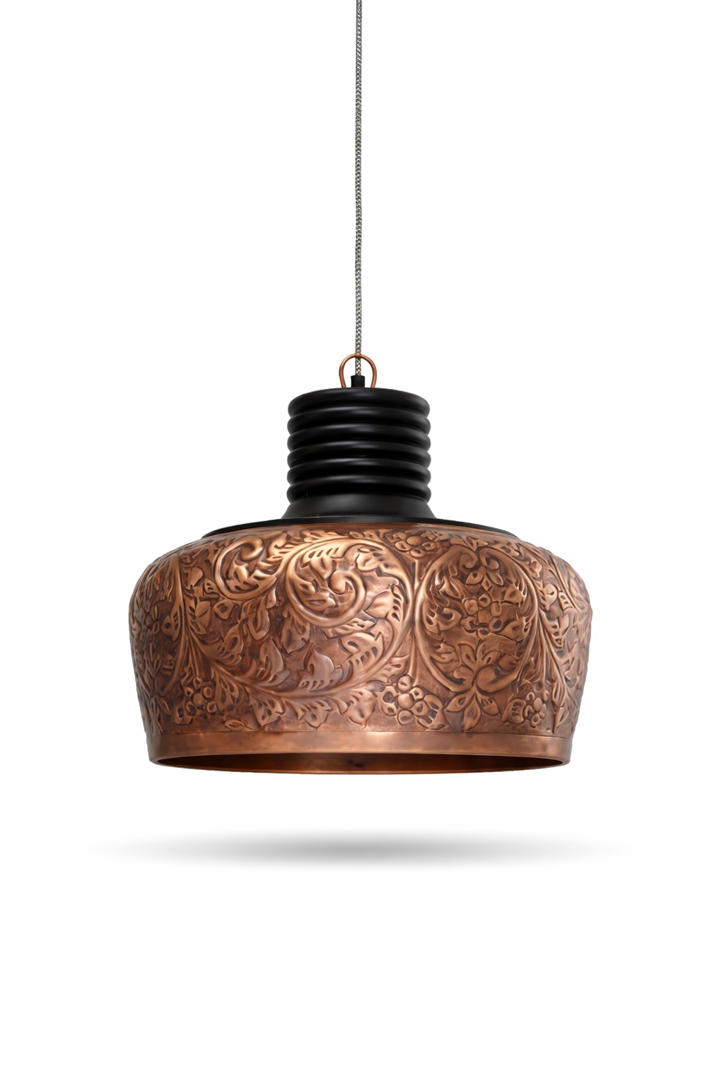 Breng warmte en karakter in uw interieur met deze prachtige PTMD hanglamp. De fraai bewerkte koperen kap is voorzien van gedetailleerde bloemmotieven, wat de lamp een rijke, ambachtelijke uitstraling geeft met een subtiele vintage touch. Elk detail in het metaalwerk getuigt van vakmanschap en creëert een uniek decoratief element.