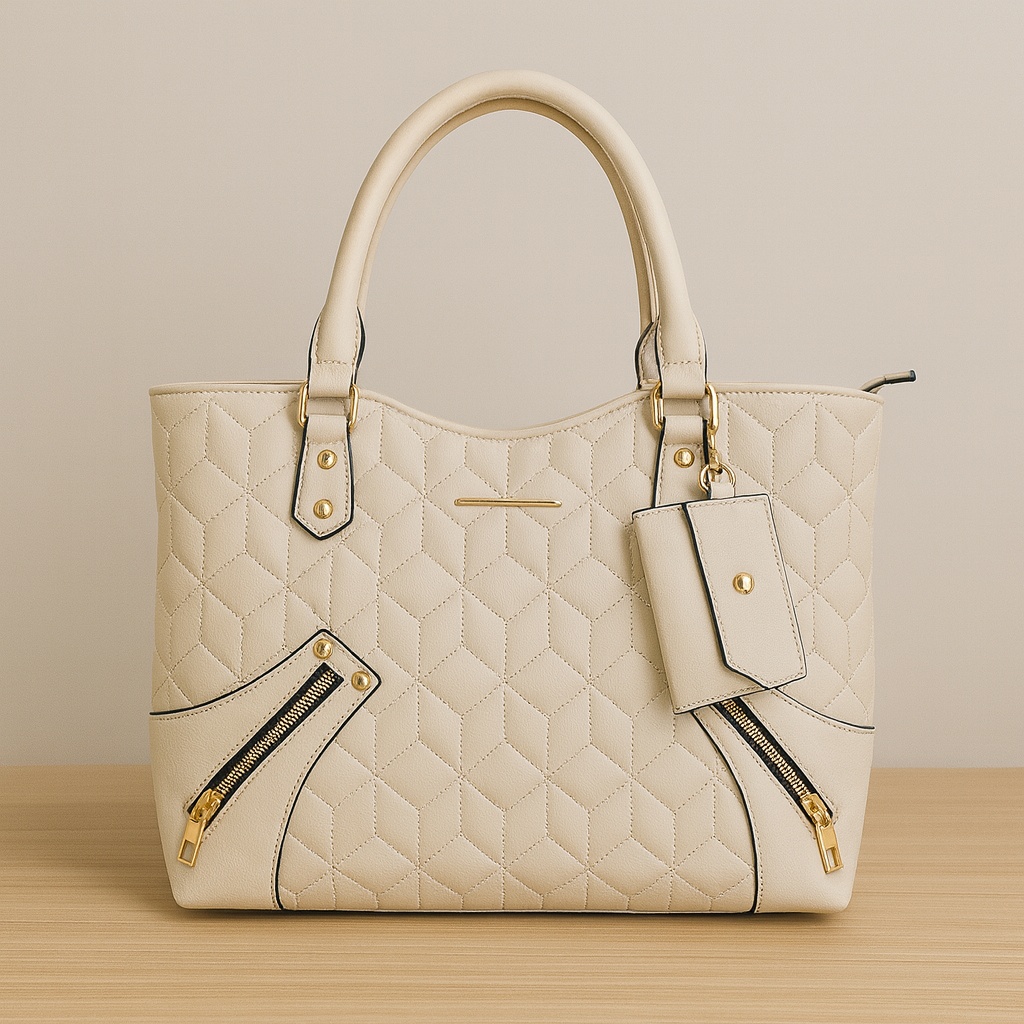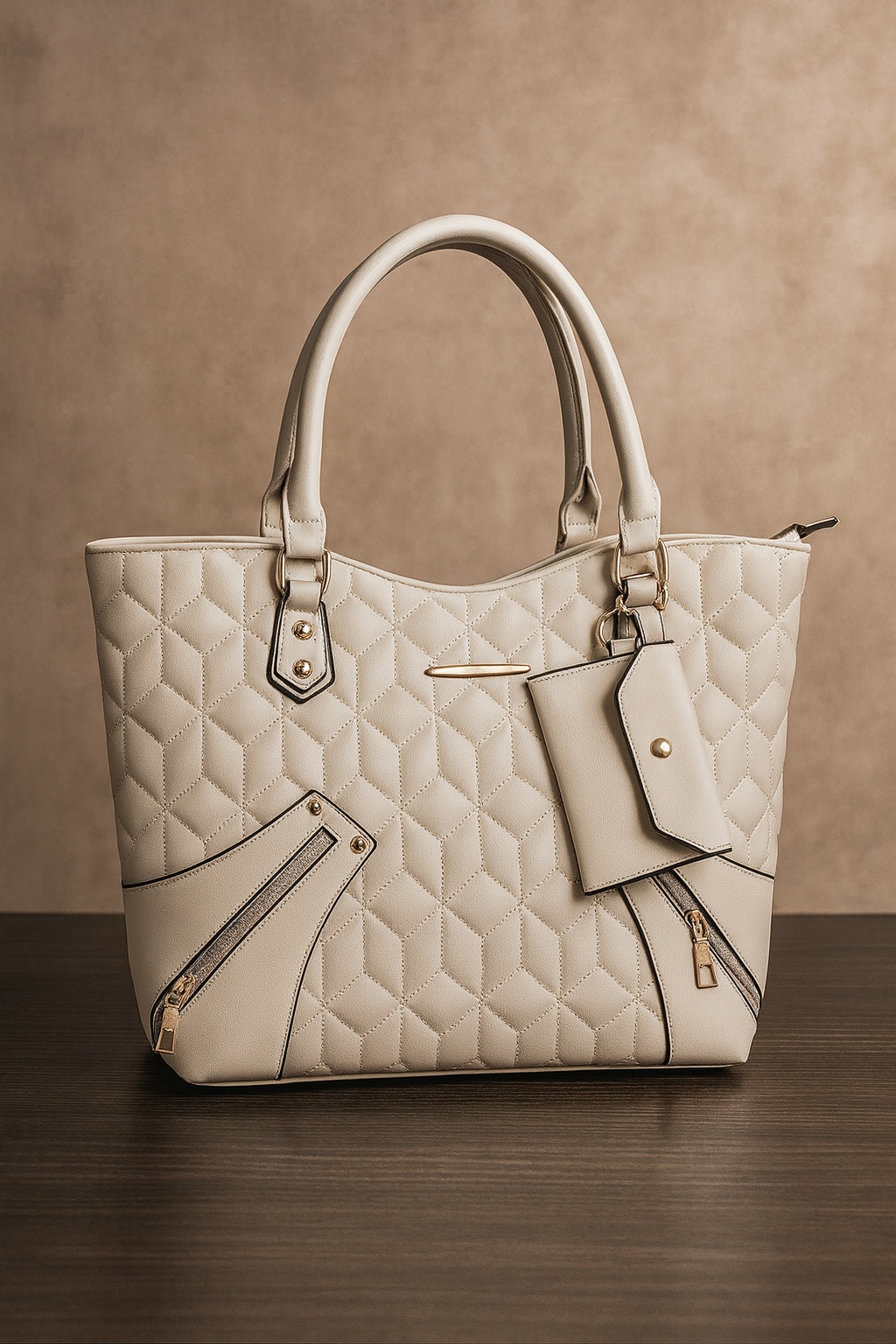 Het geometrische gewatteerde patroon voegt een moderne, luxueuze touch toe, terwijl de goudkleurige hardware een chique contrast vormt. Doordacht geplaatste ritsvakken bieden gemak en visuele aantrekkingskracht, en het afneembare mini-etui zorgt ervoor dat je essentiële spullen altijd binnen handbereik zijn.