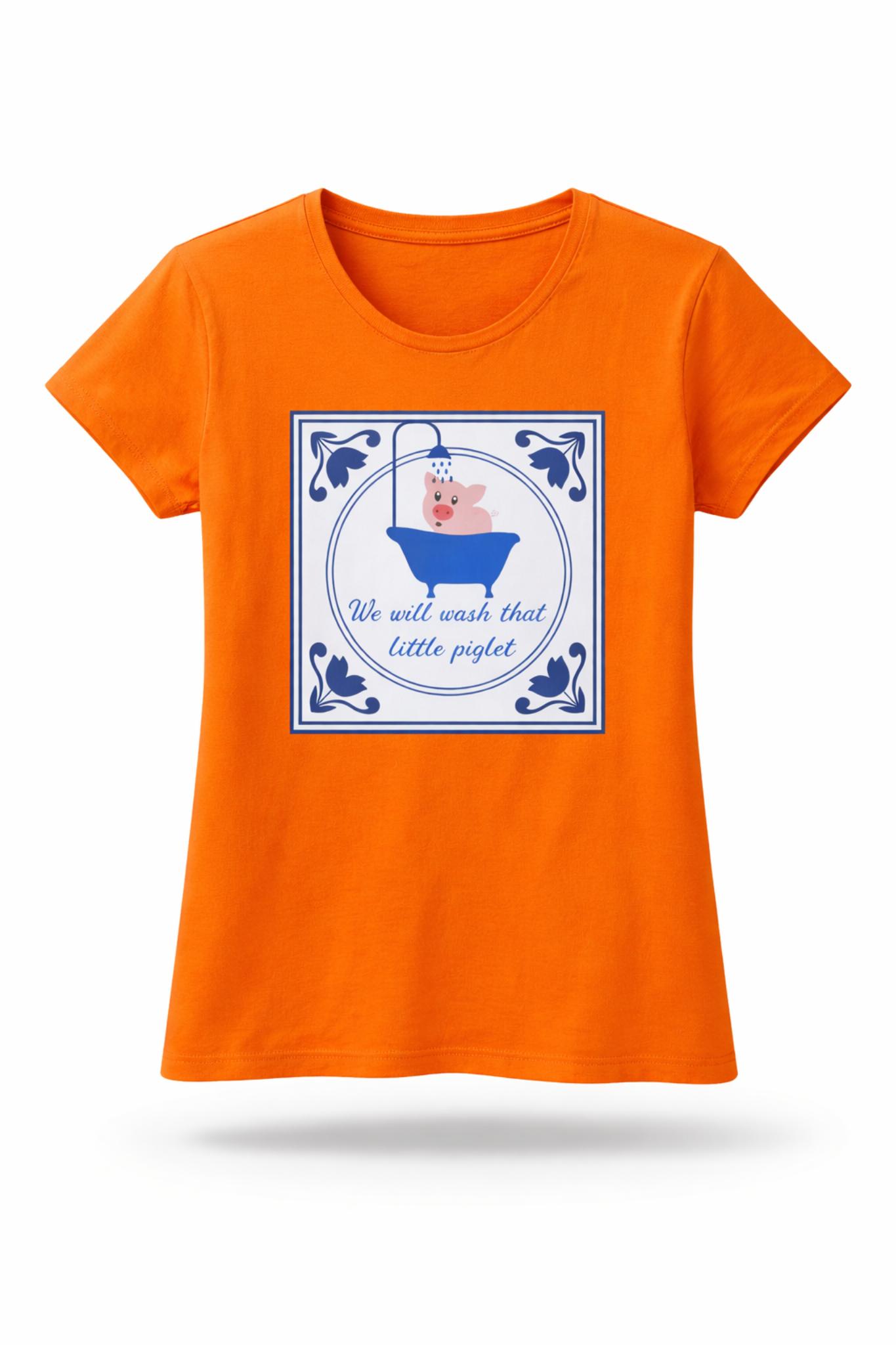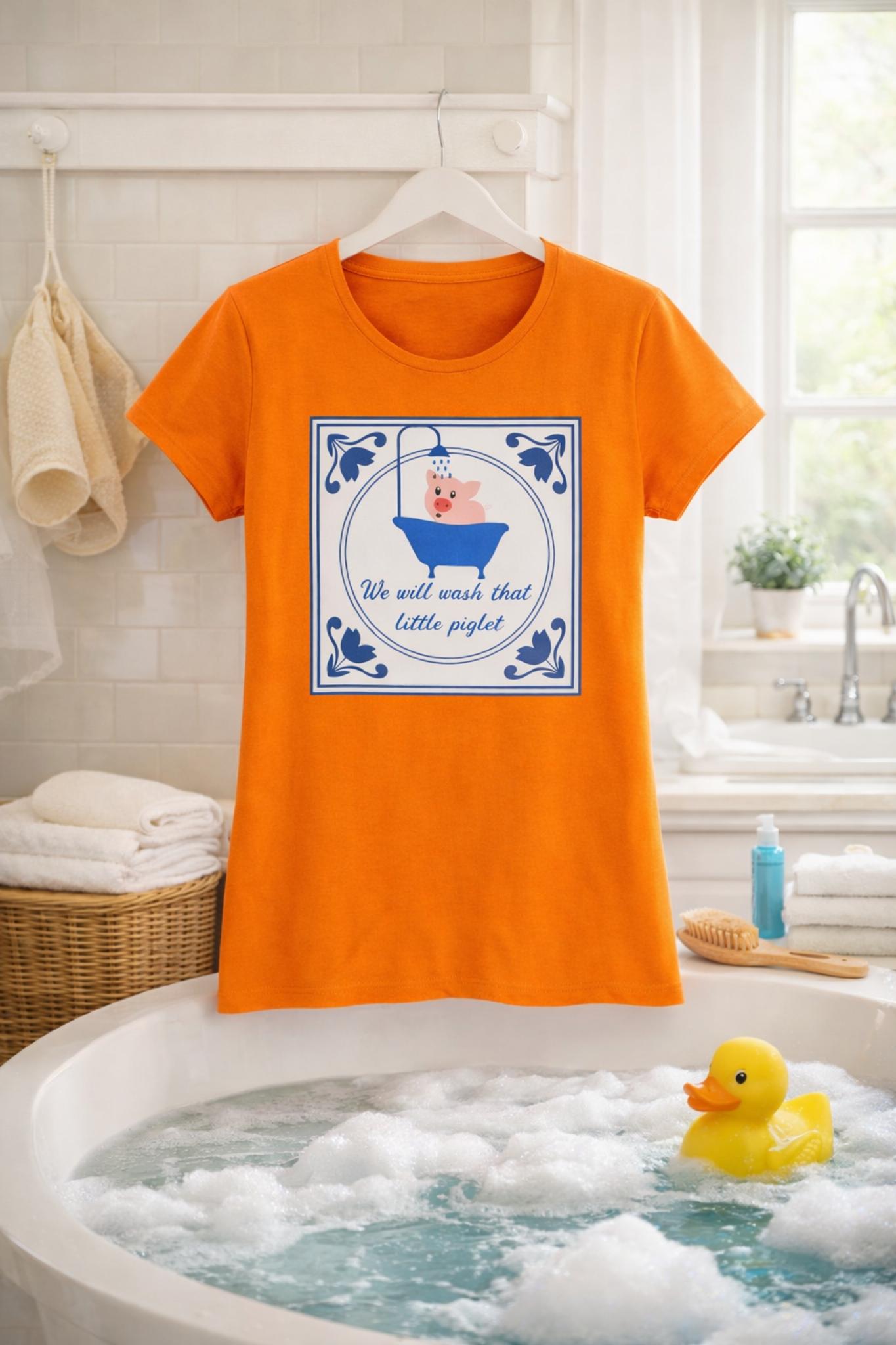 Voeg een vleugje humor en charme toe aan je garderobe met dit speelse en opvallende oranje T-shirt. Met een schattige illustratie van een biggetje dat van een bad geniet, gecombineerd met de grappige tekst “We zullen dat kleine biggetje wassen”, is dit T-shirt perfect voor iedereen die van leuke, luchtige designs houdt.