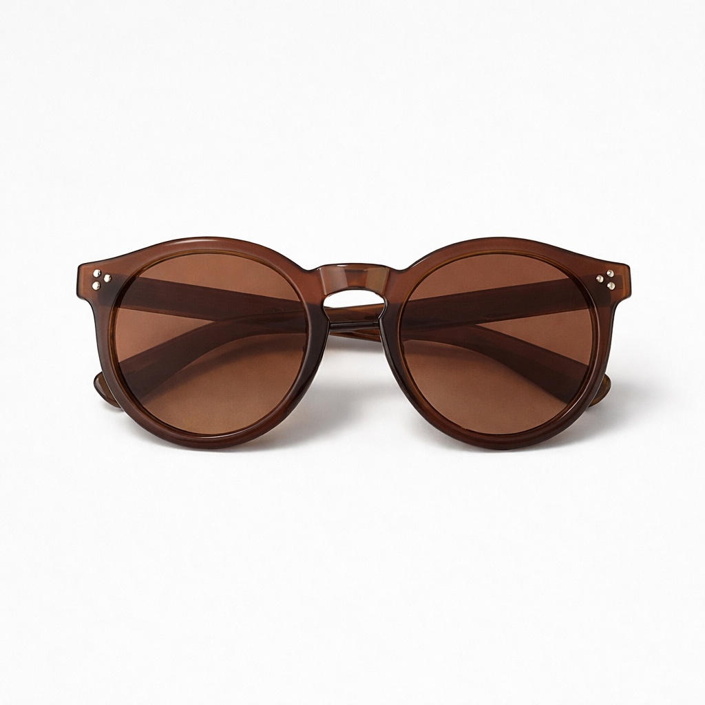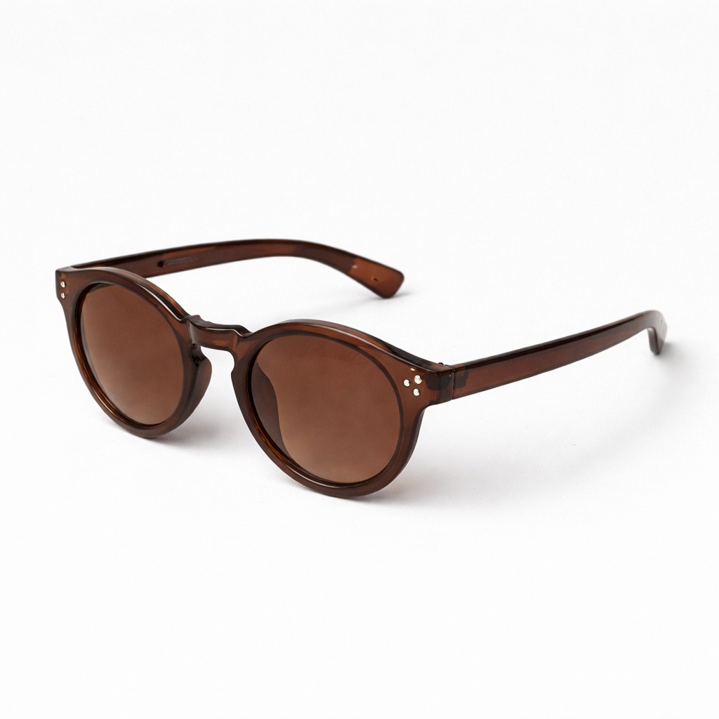 Tijdloos design en alledaagse functionaliteit komen samen in deze klassieke ronde zonnebril. Het montuur is gemaakt van doorschijnend bruin acetaat en heeft een vloeiend, evenwichtig silhouet met een verfijnde neusbrug met sleutelgatvorm voor een comfortabele en veilige pasvorm. Subtiele metalen klinknagels op de pootjes geven een premium touch en behouden tegelijkertijd een minimalistische uitstraling.
