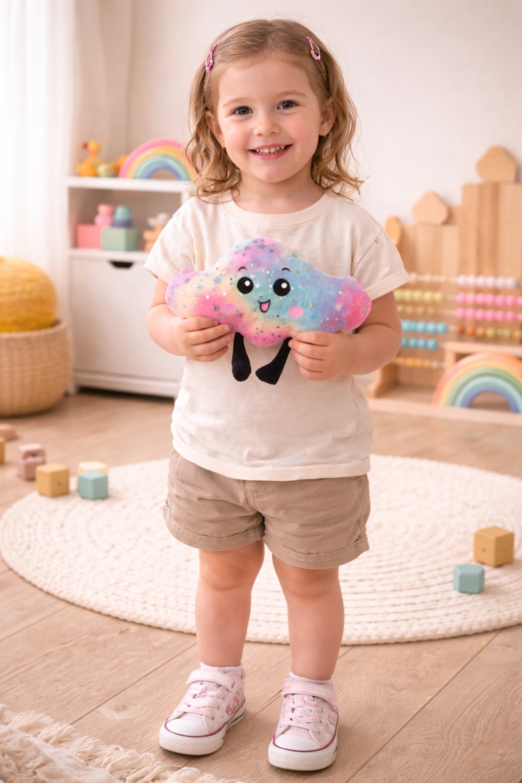 Breng een vleugje magie en kleur in de wereld van uw kind met deze schattige pastelkleurige pluche wolk. De wolk is ontworpen in een dromerige mix van roze, blauw, paars en zachtgeel en is bezaaid met glinsterende zilveren sterretjes die een subtiele sprankeling toevoegen. Het lieve geborduurde gezichtje, de roze wangen en de zachte bungelende pootjes geven de wolk een charmante persoonlijkheid waar kinderen direct verliefd op worden. Gemaakt van ultrazachte, hoogwaardige pluche stof, is de wolk heerlijk om te knuffelen en te troosten, ideaal om mee te spelen of als knusse metgezel tijdens dutjes en bedtijd.