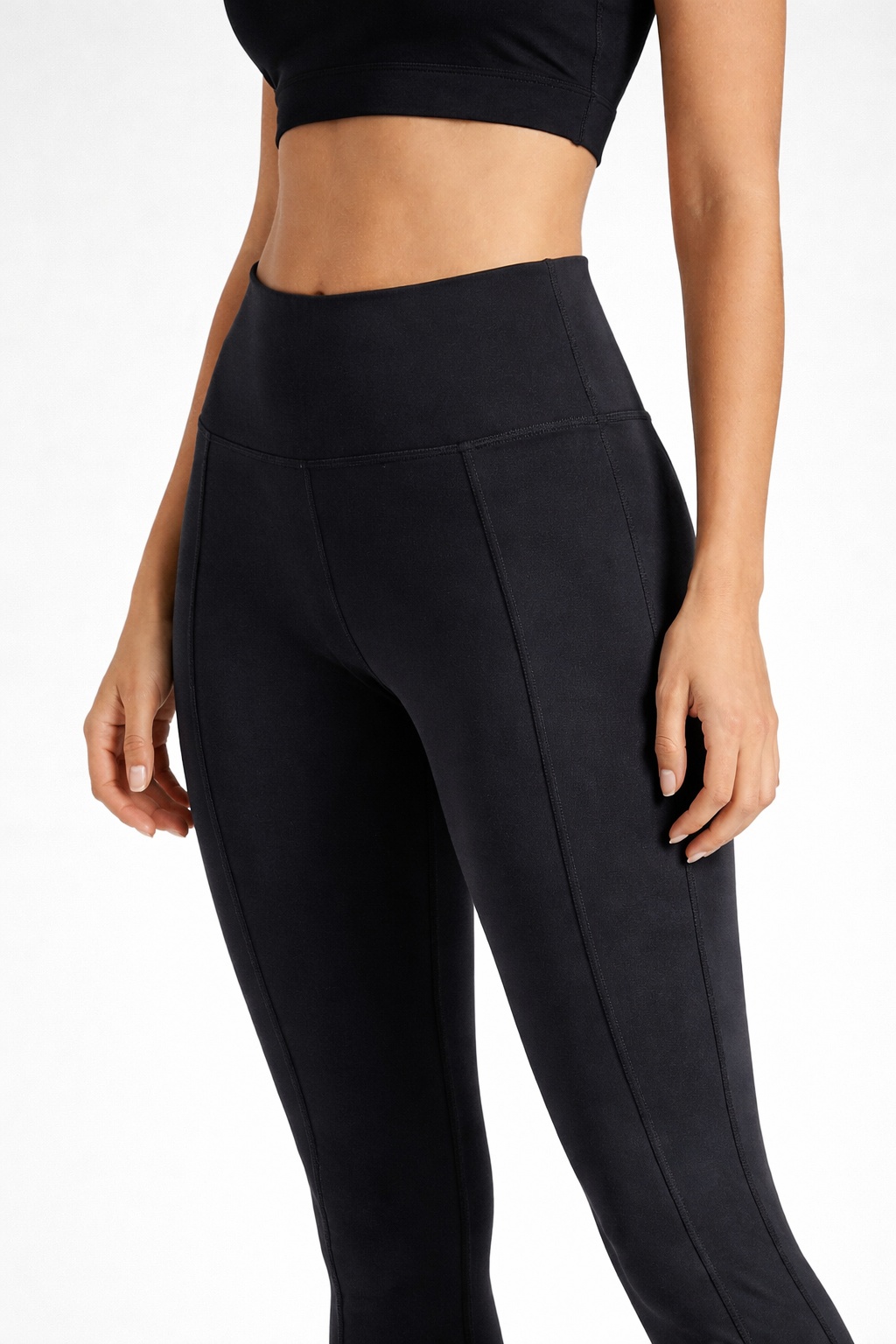 De brede tailleband zorgt voor een veilige en flatterende pasvorm, terwijl de subtiele naaddetails de natuurlijke vorm van de benen accentueren. De stof voelt zacht aan op de huid en biedt uitstekende flexibiliteit zonder zijn structuur te verliezen.